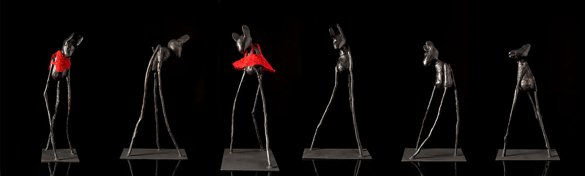 In my work I am making my mark, whether direct or negative action. To mark is to create but through the process of unmarking I seek to explore the erasure of history. Partially erasing events and discussing displacement, transitioning through levels of consciousness. Language melts away through time, becoming a memory of language- cotton thread seeking to restore the work to a higher level of consciousness. From a muted pallet of mostly black and white I birth pre-verbal dialect, not animal, not human. These black legged creatures forge their way through the duality of the disappearance of history and the formation of a new reality. Their stilt-legs represent the feeling of a longing for home; each step you take extends your legs, stretching you and feeling more and more terrestrial as you step further and further away from your homeland. Somehow, the un-landed refugee finds balance. I mark self through my works on paper, through stitching and weaving narrative, as I search for the sculpture, characterised by displacement and memory as a central theme, dealing with historical and archaic subject matter.